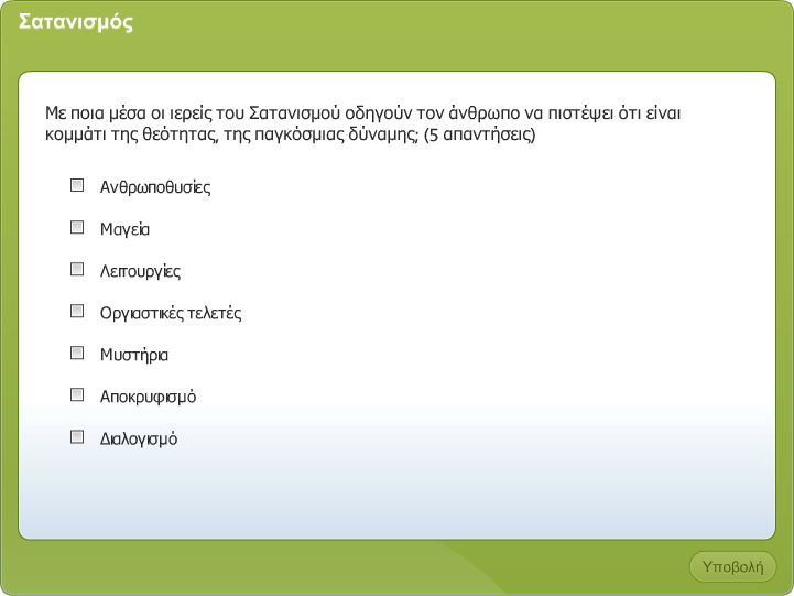 Στο 5ο μάθημα έγινε λόγος για τα πονηρά πνεύματα. Είχαμε πει και τότε ότι ο διάβολος πολεμά το έργο του Χριστού με ψευδολογίες, απάτες και τεχνάσματα. Με τους ίδιους τρόπους παραπλανά και σήμερα πολλούς ανθρώπους, που όχι μόνο τον πιστεύουν, αλλά τον έχουν θεοποιήσει και με ειδικές τελετές εκφράζουν τη λατρεία τους σ' αυτόν. Η λατρεία αυτή ονομάζεται Σατανισμός